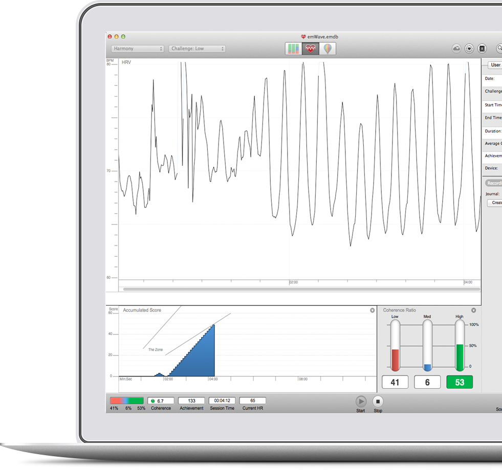 Nei colloqui individuali è possibile misurare la propria HRV e il livello di Coerenza Cardiaca tramite un sensore, applicato al lobo dell’orecchio o a un dito della mano, collegato ad un software che permette di osservare in tempo reale i cambiamenti prodotti dalle tecniche, mostrando l’effettivo stato generato di equilibro e sincronizzazione di cuore, mente e corpo.